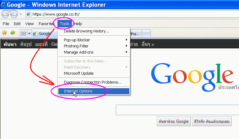 1. สำหรับเบราเซอร์ Internet Explorer ทำตามภาพเช่นกัน โดยเข้าไปที่